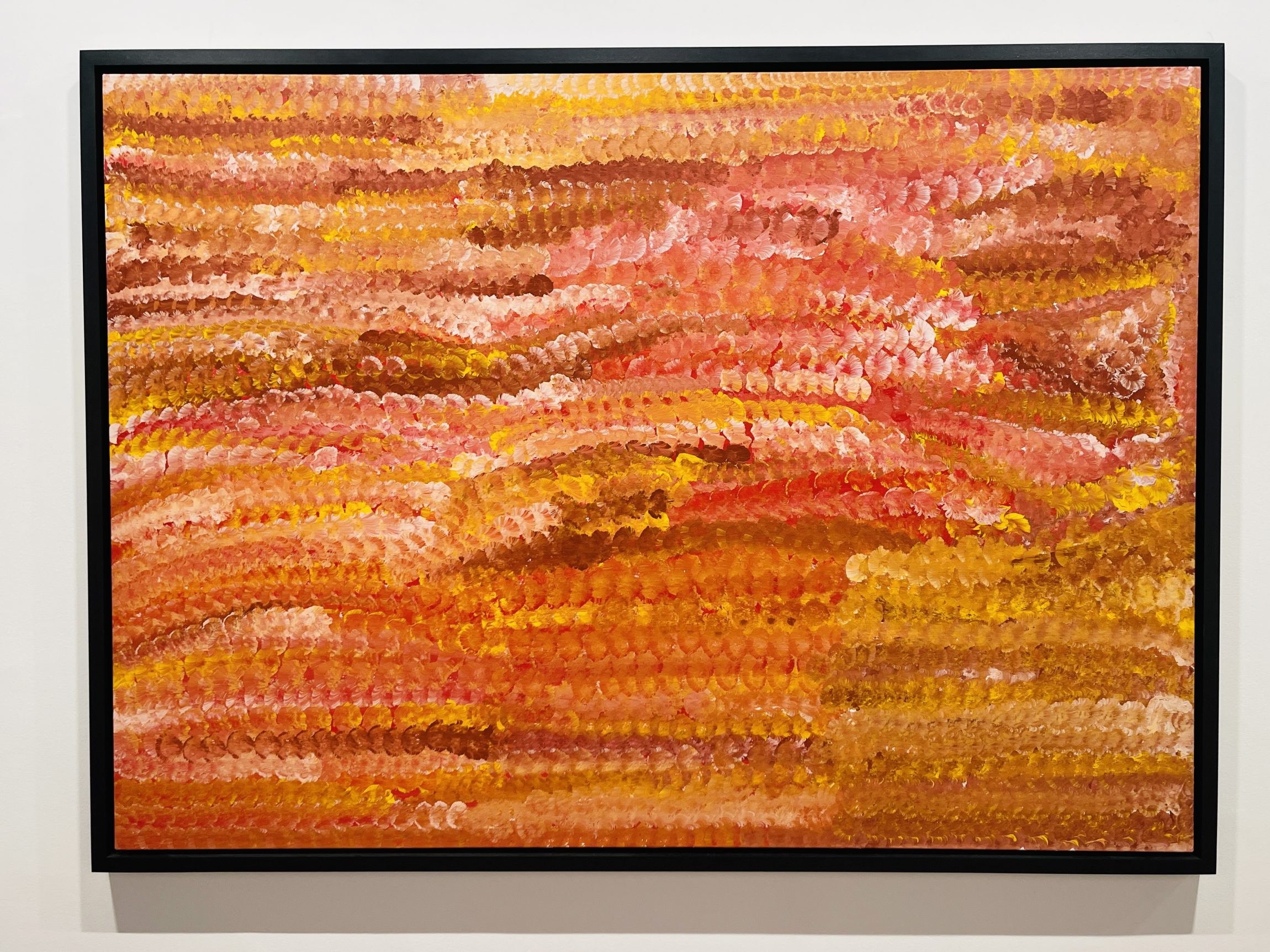 Tommy Watson Yannima’s Untju Alkata radiated deep crimsons and purples, with streaks of orange and white alive with movement — the surface shimmering like desert heat caught in paint. Standing before it, I felt both intensity and rhythm, as though the painting itself pulsed with the life of the land.
