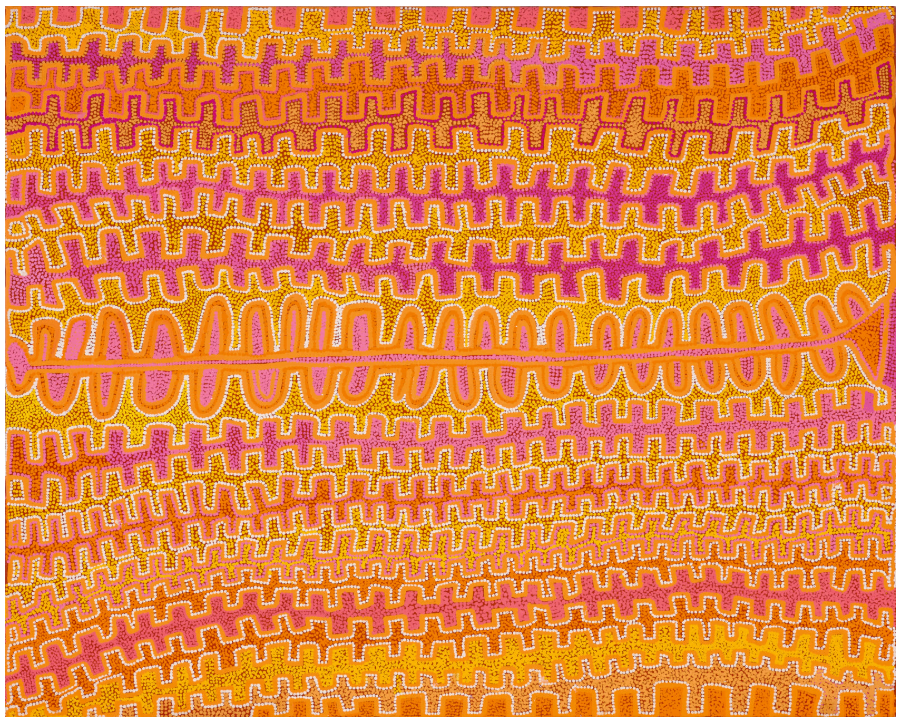 Patrick Olodoodi Tjungurrayi’s painting hums with energy. The interwoven bands of pink, orange, and gold create a sense of rhythm and movement that feels almost musical. Even from the page, it radiates warmth and vitality, capturing the pulse of Country in a way that’s too important not to share.